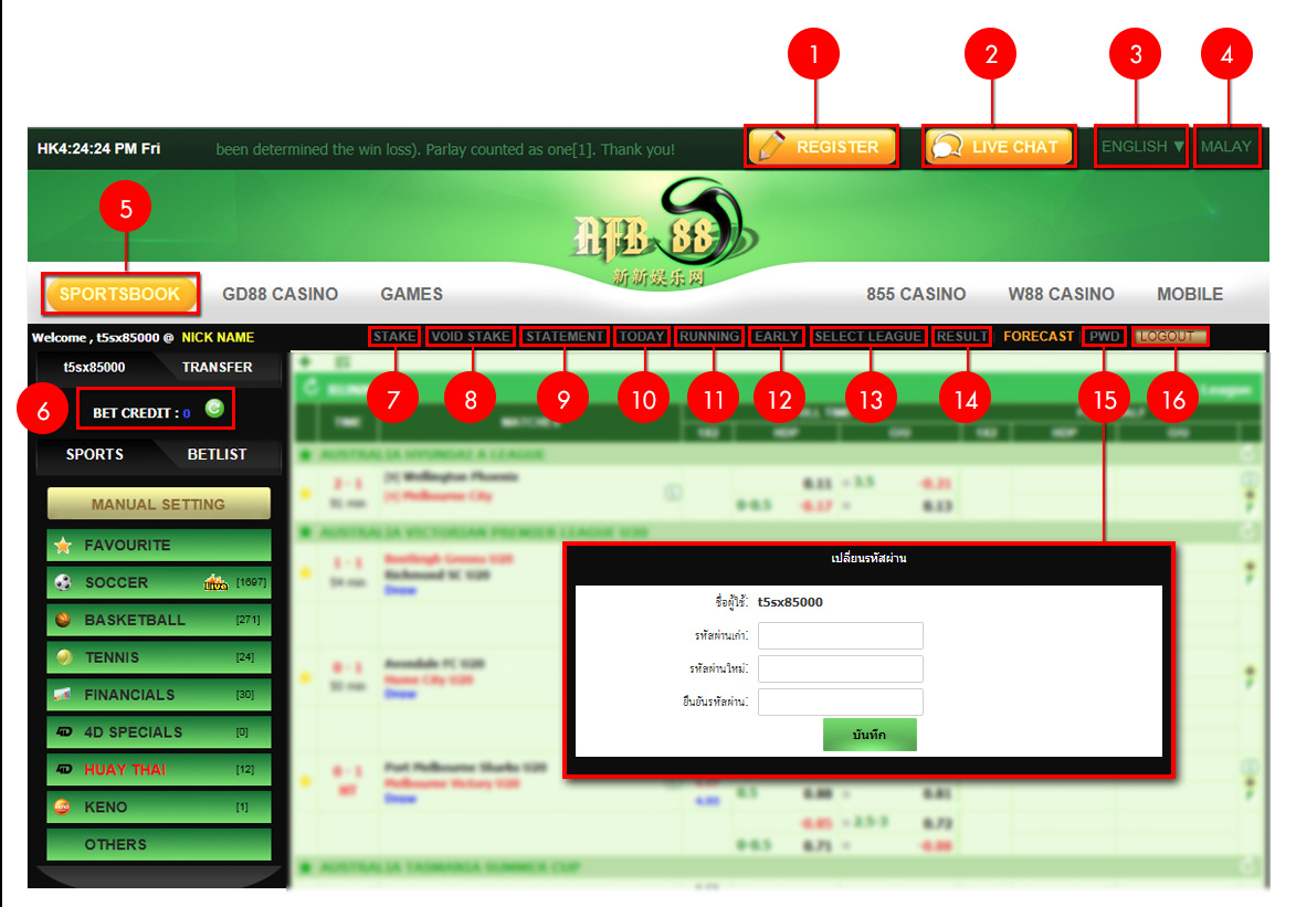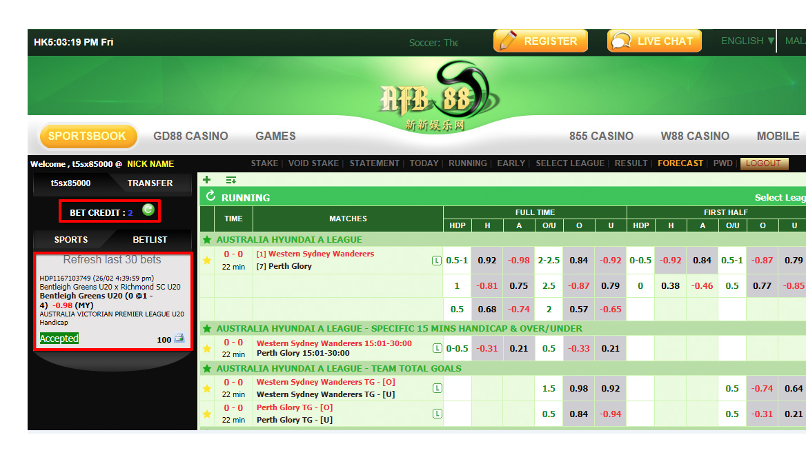 หลังจากกด BET เมนูด้านซ้ายจะขึ้นรายการที่เราแทงไป หรืออาจจะไปเช็คได้ที่ รายการพนัน (STAKE) ถ้าไม่มี แสดงว่ายังไม่มีการแทง หรือดูได้จากยอดเงินคงเหลือลดลงหรือไม่