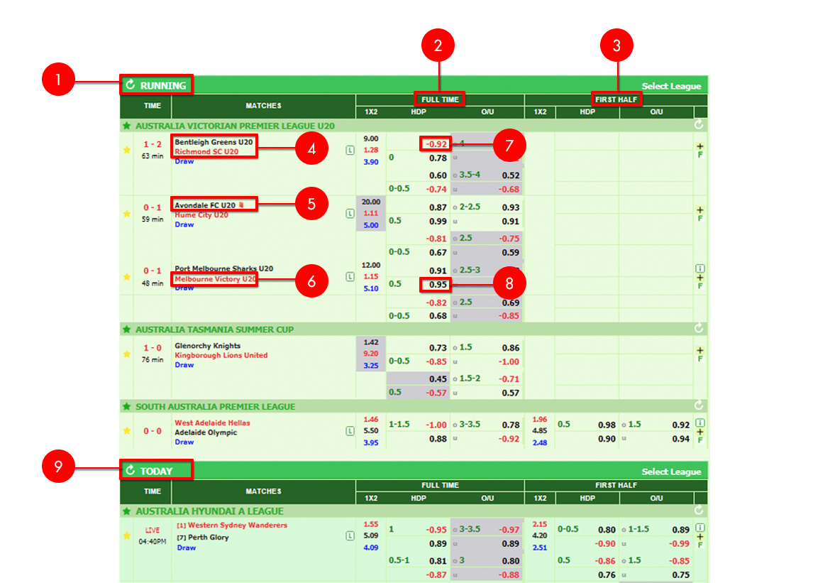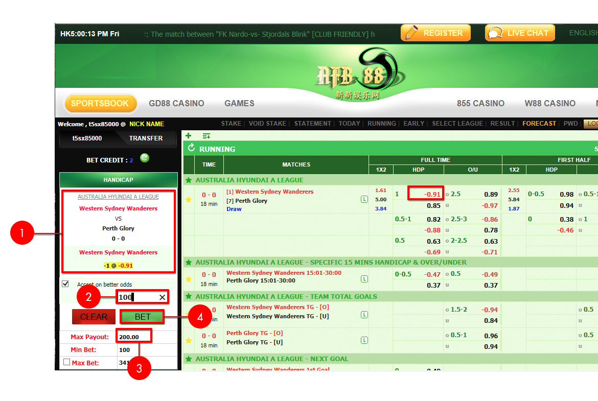 - แทงบอลเดี่ยว คู่ของ Western Sydney Wanderers VS Perth Glory ต่อ 1 ลูก ในราคา -0.91 ถ้าได้จะได้ 100 บาท ถ้าเสียจะเสีย 91 ให้เราคลิกตรงเลข -0.91