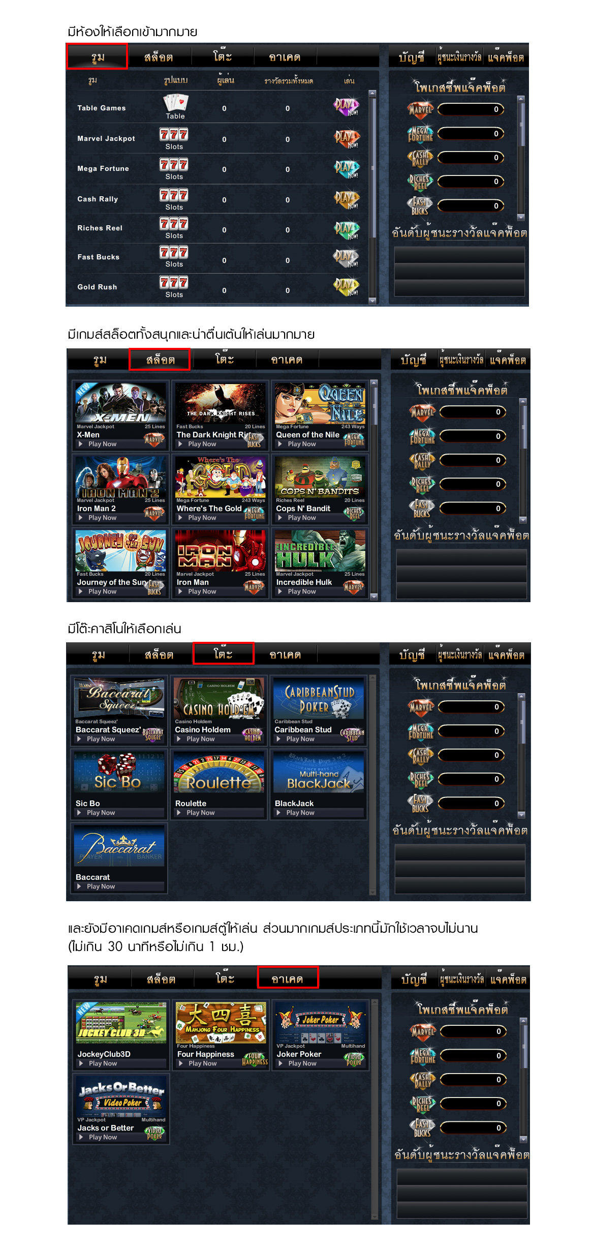 - คาสิโนมีหลายอย่างให้เลือกเล่น baccarat , blackjack , Dragon tiger , Roulette , fantan เป็นต้น
